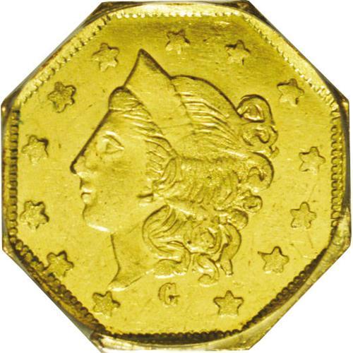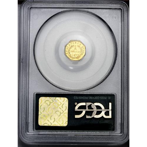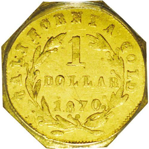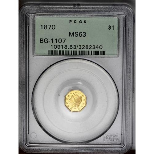 <B>1870<$1> Liberty Octagonal 1 Dollar, BG-1107, R.5, MS63 PCGS.</B></I> A prooflike and glossy straw-gold representative with some weakness of strike along the reverse border. The reverse has a pair of lengthy lintmarks, as made. A scarce variety. Certified in a green label holder. Population: 9 in 63, 2 finer (5/06).<BR><I>Ex: Lee Collection (Superior, 9/88), lot 974; Moreira Collection, Part 3 (Superior, 1/89), lot 4157; Bowers and Merena, 1/95, lot 3235.</B></I>