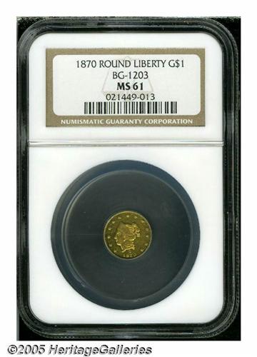 <B>1870<$1> Liberty Round 1 Dollar, BG-1203, Low R.5, MS61 NGC.</B></I> A suitably struck piece, only the O in DOLLAR is not crisply impressed. The fields are cloudy with slide marks, typical of the grade. Period Two Round Octagonal Dollars are scarce.