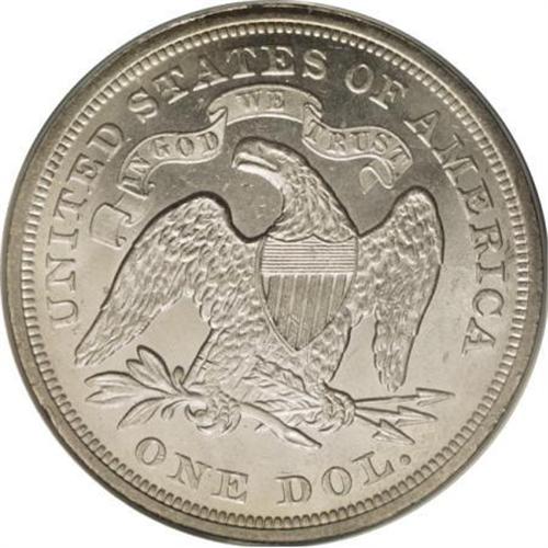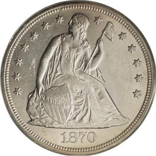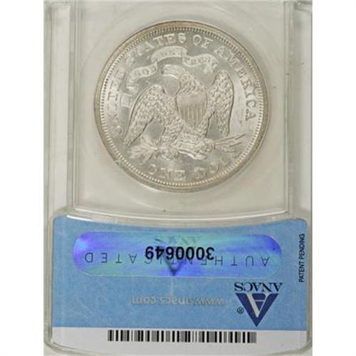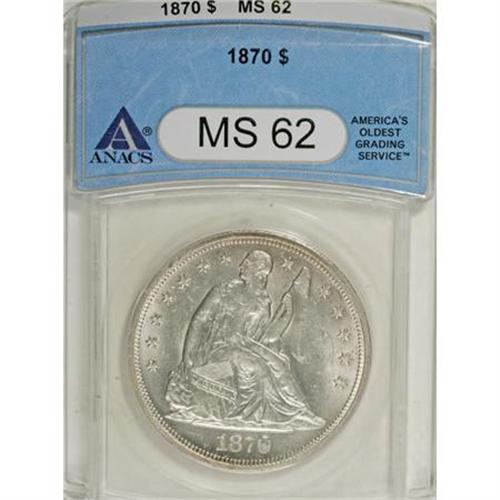 <B>1870 $1 MS62 ANACS.</B></I> Breen-5483. The 1870 is scarce in Mint State, since it was principally struck for export to the Orient. An untoned and satiny example with a good strike and a smooth reverse. The obverse is moderately abraded. IN GOD WE TRUST and the left wing feathers are lightly die doubled.<BR><BR><B>Coin Engraver:</B> Christian Gobrecht<BR><BR><b>Shipping:</b> Coins & Currency (<a target="_blank" href="http://www.heritageauctions.com/common/shipping.php">view shipping information</a>)