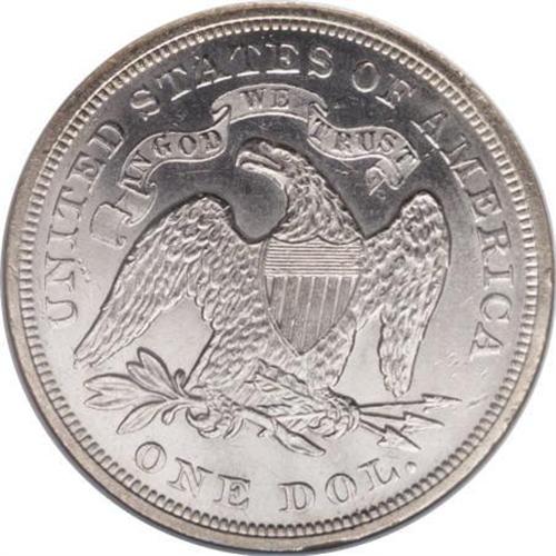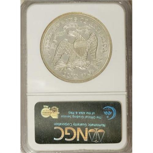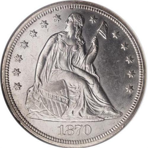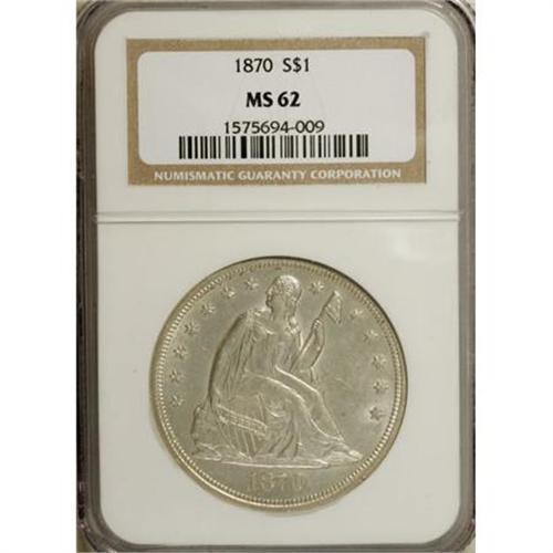 <B>1870 $1 MS62 NGC.</B></I> Since silver dollars were worth more in bullion value than their face value until after 1873, serious collecting of new silver dollar issues likely started only afterward. While circulated 1870 Seated dollars are plentiful, according to Bowers, Mint State pieces are rare. This coin is silver-white with a faint blush of gold, and has the appearance of a finer grade despite numerous small and undistracting abrasions. Census: 11 in 62, 34 finer (6/07).<BR><BR><B>Coin Engraver:</B> Christian Gobrecht<BR><BR><b>Shipping:</b> Coins & Currency (<a target="_blank" href="http://www.heritageauctions.com/common/shipping.php">view shipping information</a>\)