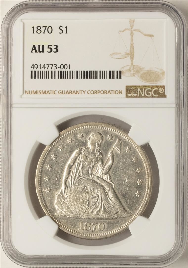 One 1870 $1 Seated Liberty Silver Dollar Coin NGC AU53. NGC Certified.