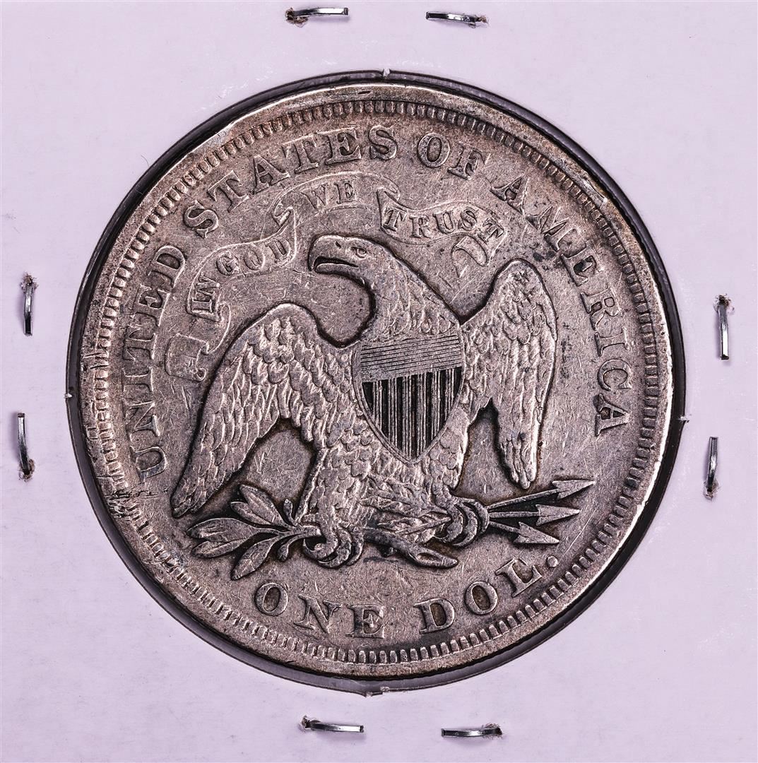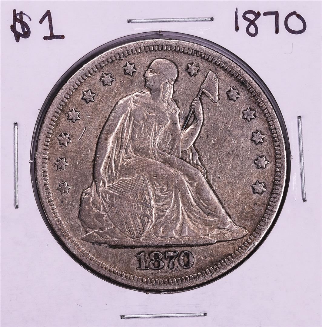 One 1870 $1 Seated Liberty Silver Dollar Coin.