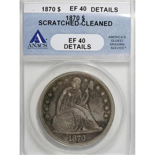 <B>1870 $1 --Cleaned, Scratched--ANACS. XF40 Details.</B></I> NGC Census: (16/115). PCGS Population (10/163). Mintage: 415,000. Numismedia Wsl. Price for NGC/PCGS coin in XF40: $417. (#6963)<BR><BR><B>Coin Engraver:</B> Christian Gobrecht<BR><BR><b>Shipping:</b> Coins & Currency (<a target="_blank" href="http://www.heritageauctions.com/common/shipping.php">view shipping information</a>)