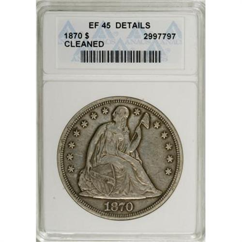 <B>1870 $1 --Cleaned--ANACS. EF45 Details.</B></I> NGC Census: (10/103). PCGS Population (26/135). Mintage: 415,000. Numismedia Wsl. Price for NGC/PCGS coin in XF45: $455. (#6963)<BR><BR><B>Coin Engraver:</B> Christian Gobrecht<BR><BR><b>Shipping:</b> Coins & Currency (<a target="_blank" href="http://www.heritageauctions.com/common/shipping.php">view shipping information</a>)