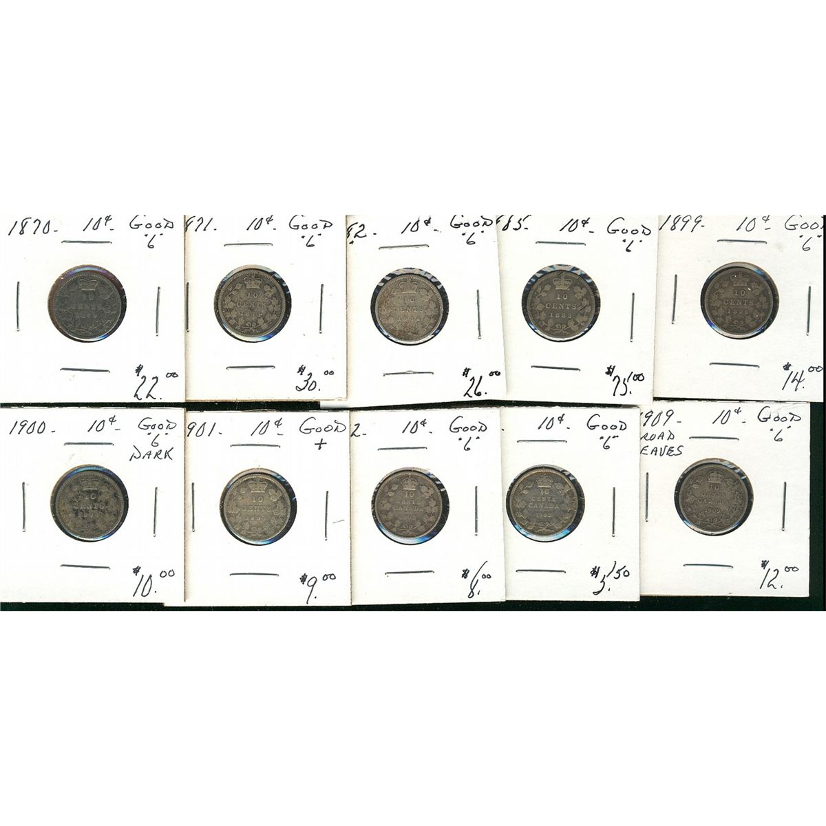 1870 10¢, 1871, 1882H, 1885, 1899, 1900, 1901, 1902, 1902H & 1909 BL. Lot of 10 coins all Good+. (PB