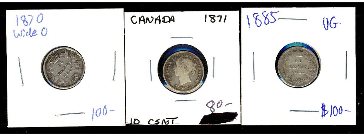 1870 10¢, 1871 & 1885. Lot of 3 coins abt VG.