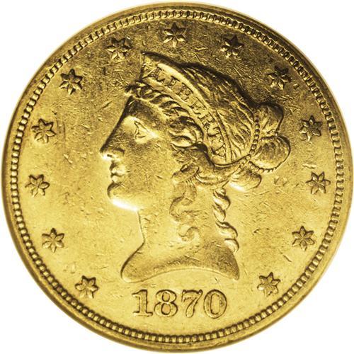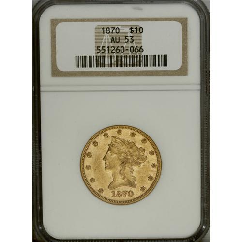 1870 $10 AU53 NGC. A rare date in all grades. Only 3,9