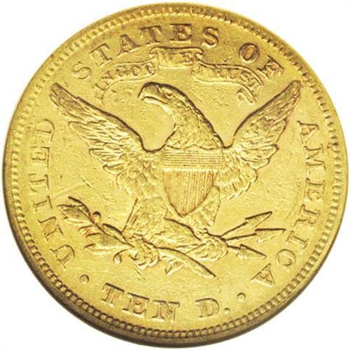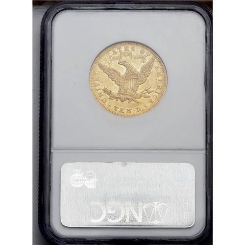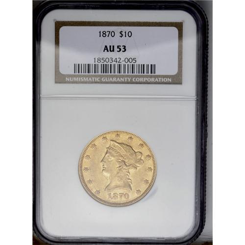 <B>1870<$10> AU53 NGC.</B></I> Deep honey-gold color with minor abrasions. Considerable luster remains, and the fields exhibit slight reflectivity, especially on the reverse. This is a scarce issue from a low mintage of just 3,990 coins. Relatively few have survived, and most that do exist are in the lower grade levels. Although more examples have been identified in recent years, David Akers once stated that he had only seen one AU grade example of this date.