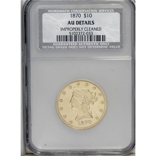 1870 $10 --Improperly Cleaned--NGC. AU Details. Nicely