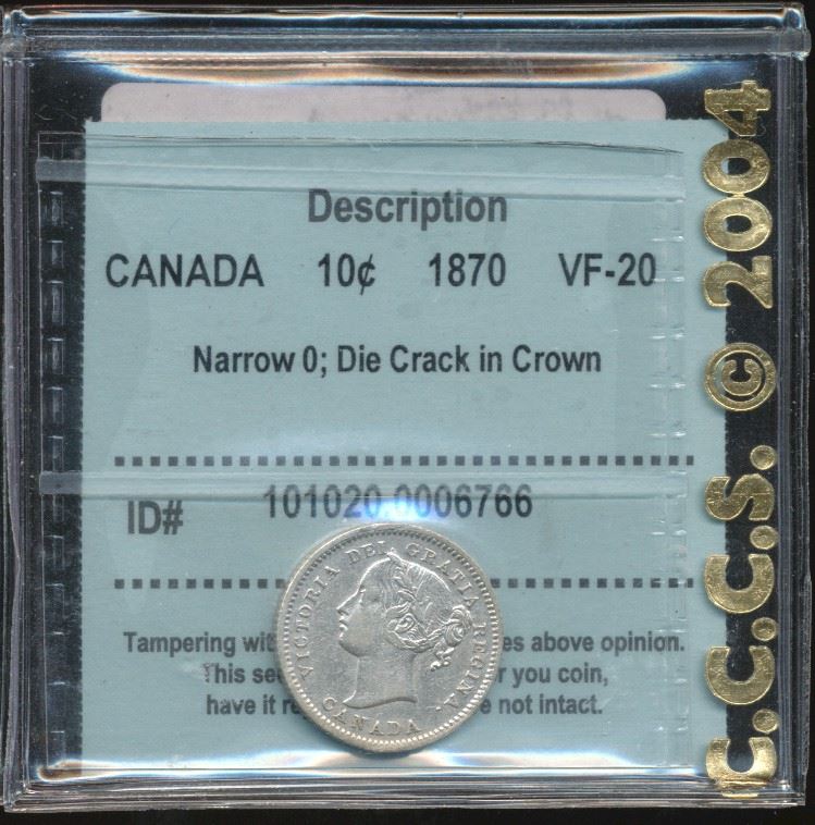 1870 10¢ Nar 0 CCCS VF20. Designated with Die crack in crown.