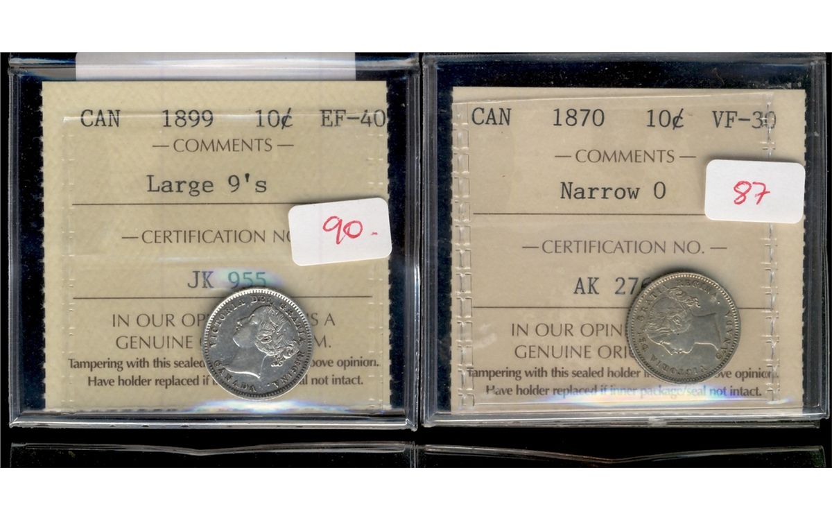 1870 10¢ Nar 0 VF30 & 1899 Lg 9's EF40.  Lot of 2 ICCS graded coins.