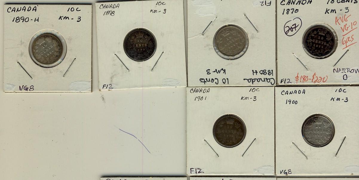 1870 10¢ Nar , 1880H, 1898, 1890H, 1900, 1901 10¢, average grades VG10, 6 pieces.