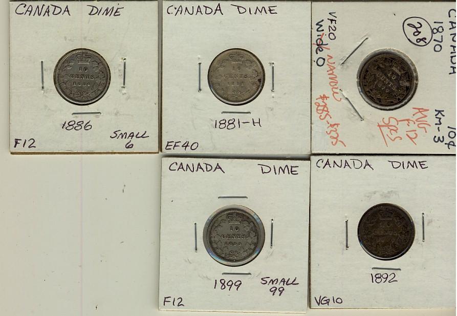 1870 10¢ Nar, 1881H, 1886 Sm., 1892 Sm, 1899 Sm 10¢, average grades F-12, 5 pieces.