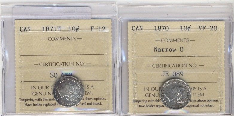 1870 10¢ Nr 0 VF20 & 1871H F12. Lot of 2 ICCS coins.