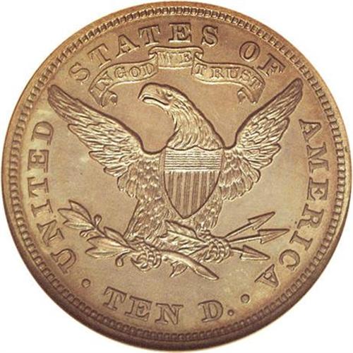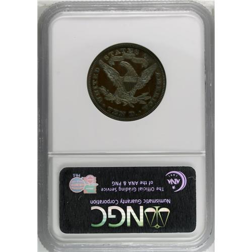 <B>1870<$10> Ten Dollar, Judd-1035, Pollock-1170, R.8, PR66 Brown NGC.</B></I> Both the obverse and reverse are struck with the regular issue design for 1870 ten dollar gold coins. Struck in copper with a reeded edge. Both sides exhibit a rich chocolate-brown appearance with a thin overlay of turquoise-blue patina that is most attractive as the coin turns under a light source. There are no notable defects or marks. The only pedigree identifier is a small carbon spot on Liberty's upper hair bun. Since this exceedingly rare pattern is listed as R.8, there are probably only two known examples, both of which have now been offered by Heritage Auction Galleries--the other was a Proof 60 we sold in 1997. A truly remarkable opportunity for the pattern enthusiast.