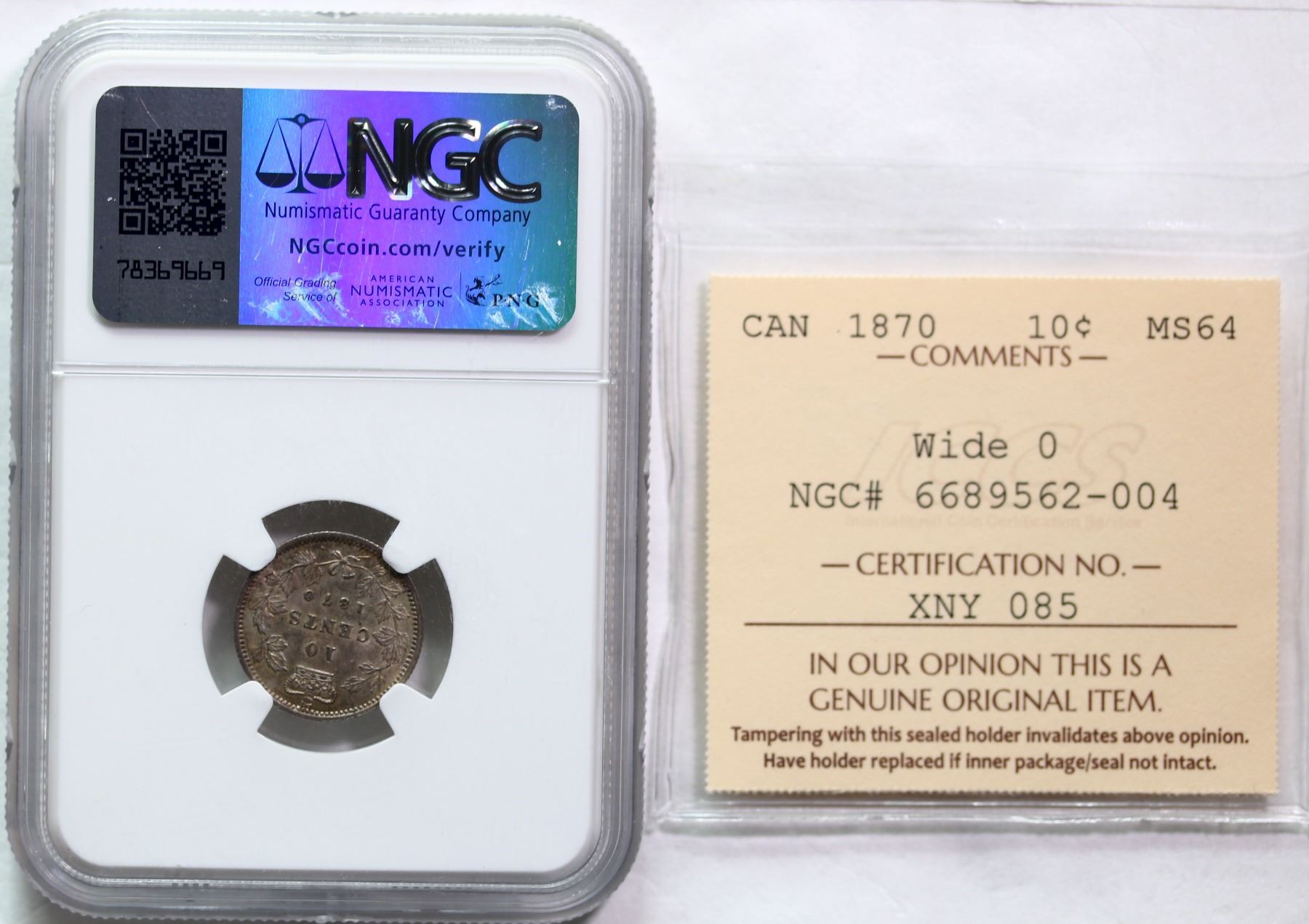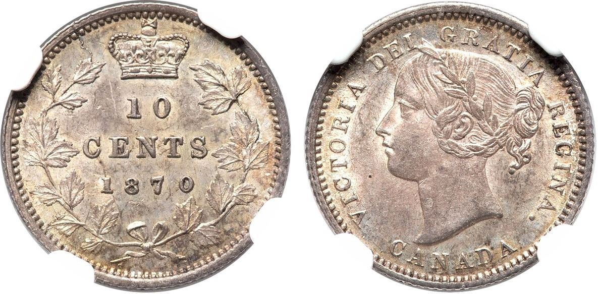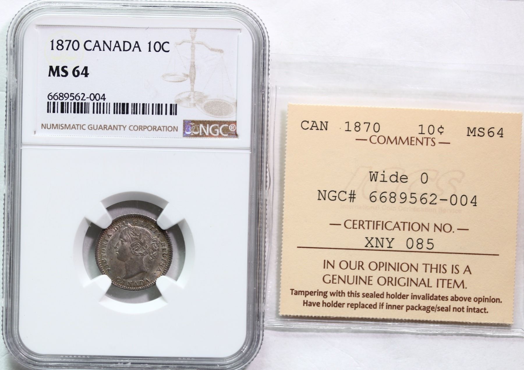 1870 10¢ "Wide O" ICCS & NGC Very Choice Mint State-64. Delicate pink, gold and russet tones over full underlying lustre. Very scarce variety and seldom seen and offered in this condition.