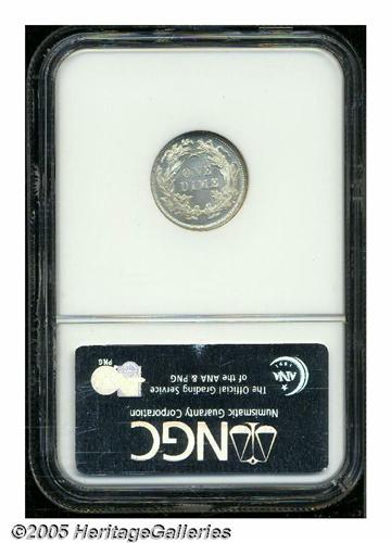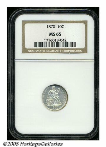 <B>1870<10C> MS65 NGC.</B></I> Lustrous, faintly golden, Gem example with a nearly prooflike surfaces. A few scattered pin marks, as anticipated, are noted only under close inspection. Population: 8 in 65, 3 finer (6/05).