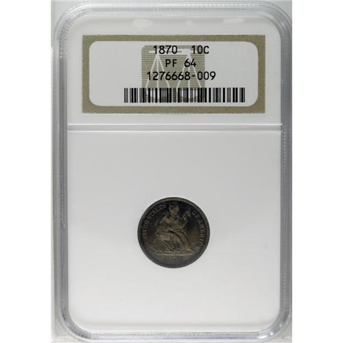 <B>1870<10C> PR64 NGC.</B></I> Brown-red, gold, and violet cover this near-Gem's original surfaces. The toning and mirrors deepen on the reverse and create a slight cameo effect.