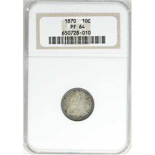<B>1870 10C PR64 NGC.</B></I> A medley of cobalt-blue, orange, lime-green, and lilac dominates the obverse, and clings to the reverse margins. An attentive strike sharpens the design elements. Light roller marks are visible on Liberty's face. Census: 48 in 64, 29 finer (1/08).<BR><BR><B>Coin Engraver:</B> Christian Gobrecht<BR><BR><b>Shipping:</b> Coins & Currency (<a target="_blank" href="http://www.heritageauctions.com/common/shipping.php">view shipping information</a>)