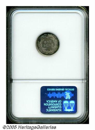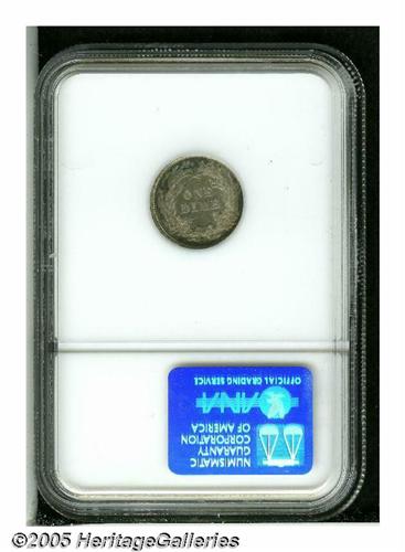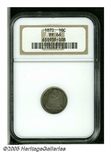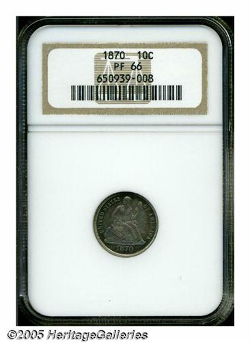 <B>1870<10C> PR66 NGC.</B></I> The nicely mirrored surfaces show a few light die striations, not to be confused with hairlines. Multicolored iridescent toning is seen particularly at the border areas on the obverse, while the center of the reverse is mostly brilliant and shows some speckled brown color. A excellent choice as a type coin. Population: 10 in 66, 1 finer (4/05).