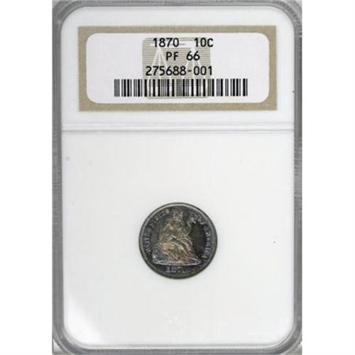 <B>1870 10C PR66 NGC.</B></I> Amazingly deep layers of purple-rose and electric-blue toning blanket both sides of this lovely Premium Gem proof. The design motifs are crisply reproduced and the surfaces are virtually untouched. Highly recommended to the connoisseur of original toning. Census: 10 in 66, 1 finer (10/07). <BR><BR><B>Coin Engraver:</B> Christian Gobrecht<BR><BR><b>Shipping:</b> Coins & Currency (<a target="_blank" href="http://www.heritageauctions.com/common/shipping.php">view shipping information</a>)