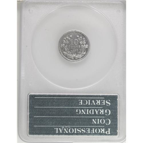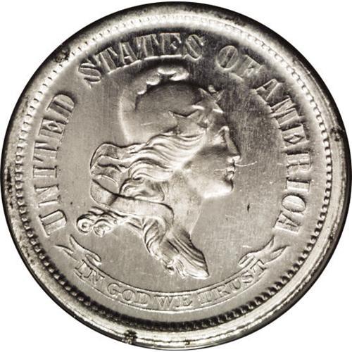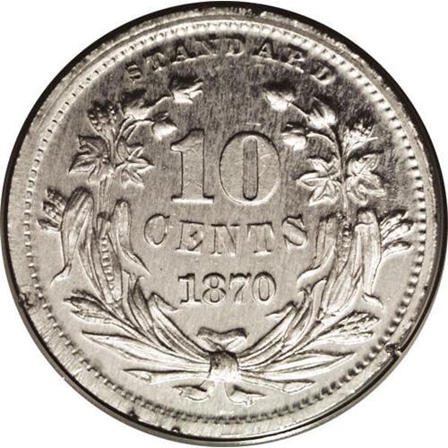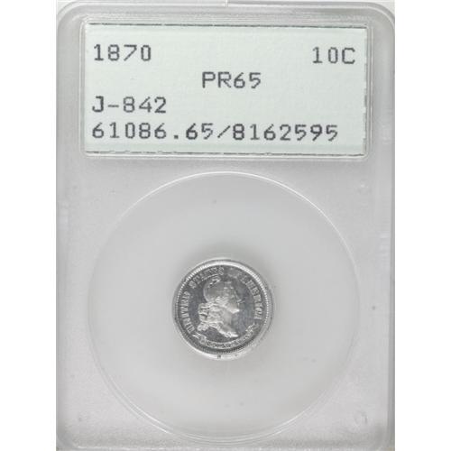 <B>1870 10C Standard Silver Dime, Judd-842, Pollock-934, High R.7, PR65 PCGS.</B></I> Standard Silver Design A: Liberty wears a cap with three stars as more fully described for Judd-696. The denomination and date on the reverse are enclosed by a wreath of cotton and corn with STANDARD above. Struck in aluminum with a plain edge. Light, hazy iridescence does not obscure the mirrored qualities of this carefully preserved specimen. A small lintmark over and before Liberty's nose and a few planchet flaws around the reverse rim are all noted for accuracy. Housed in a first-generation PCGS holder.<BR><I>From The Jones Beach Collection.</B></I><BR><BR><b>Shipping:</b> Coin/Currency (<a target="_blank" href="http://www.heritageauctions.com/common/shipping.php">view shipping information</a>)