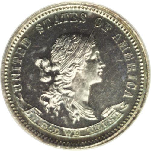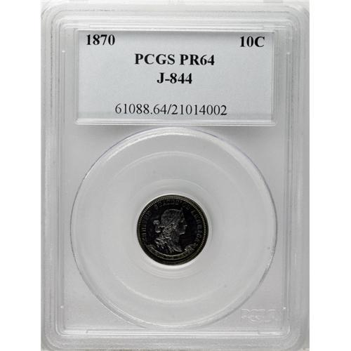 <B>1870 10C Standard Silver Dime, Judd-844, Pollock-943, Low R.6, PR64 PCGS.</B></I> Standard Silver Design B: Liberty wears a diadem with her hair tied in a bun as more fully described for Judd-702. The reverse carries the denomination and date inside a wreath of corn and cotton with STANDARD above. Struck in silver with a plain edge. Deeply toned with fully mirrored fields beneath steel, sea-green, and gold color. This is a splendid near-Gem with exceptional eye appeal.<BR><I>From The Jones Beach Collection.</B></I><BR><BR><b>Shipping:</b> Coin/Currency (<a target="_blank" href="http://www.heritageauctions.com/common/shipping.php">view shipping information</a>)