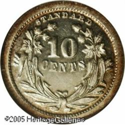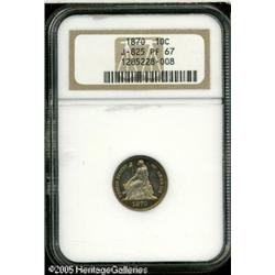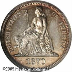 <B>1870 10C Standard Silver Ten Cents, Judd-825, Pollock-915, Low R.7, PR67 NGC.</B></I> A figure of Liberty seated faces left. She supports a shield and a Liberty pole stands behind. The reverse shows the denomination 10 CENTS within a wreath of cotton and corn, the inscription STANDARD is above. Struck in silver with a reeded edge. A simply stunning Superb Gem, both sides are deeply reflective with bright centers and olive-orange peripheral toning. There is a small pinscratch in the left obverse field. The present piece is the only example of Judd-825 certified by NGC, as of (1/05).<BR><I>From The Mike Jacobson Collection.</B></I> Lot:9852