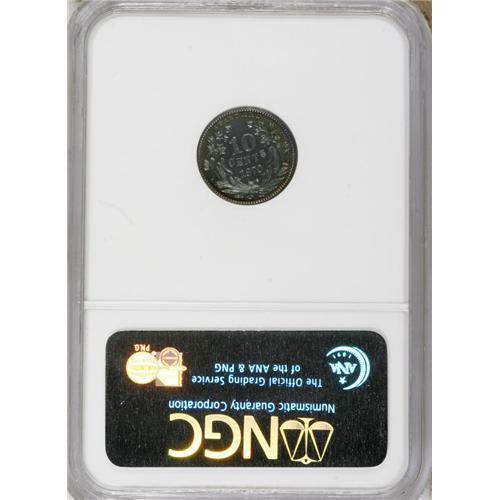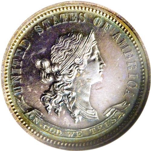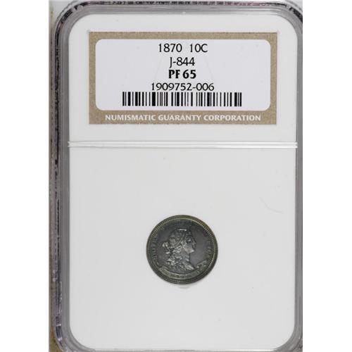<B>1870 10C Standard Silver Ten Cents, Judd-844, Pollock-943, Low R.6, PR65 NGC.</B></I> The obverse has a head of Liberty with a diadem in her hair and a scroll beneath the bust rather than the date. The reverse is simply laid out with 10 CENTS in the center, surrounded by a wreath of cotton and corn with STANDARD above. Struck in silver with a plain edge. The fields are deeply mirrored, and the obverse shows uniform traces of die rust. The light gray centers deepen to sea-green around the margins.<BR><BR><b>Shipping:</b> Coins & Currency (<a target="_blank" href="http://www.heritageauctions.com/common/shipping.php">view shipping information</a>)