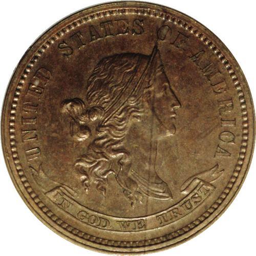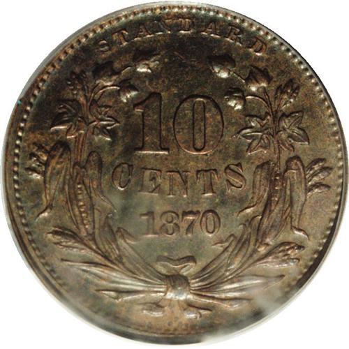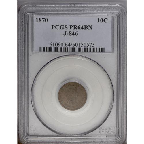 <B>1870 10C Standard Silver Ten Cents, Judd-846, Pollock-945, Low R.7, PR64 Brown PCGS.</B></I> Standard Silver design with a right-facing bust of Liberty on the obverse and the motto IN GOD WE TRUST on a scroll below. Liberty is wearing a diadem, and the legend UNITED STATES OF AMERICA is around the border. The denomination 10 CENTS and the date 1870 are centered on the reverse within a wreath of cotton and corn. The word STANDARD is at the top. Struck in copper with a plain edge. Tinges of orange-red luster hug the denticles and peripheral devices of this otherwise toned, blue-brown representative. Population: 3 in 64, 3 finer (1/06).
