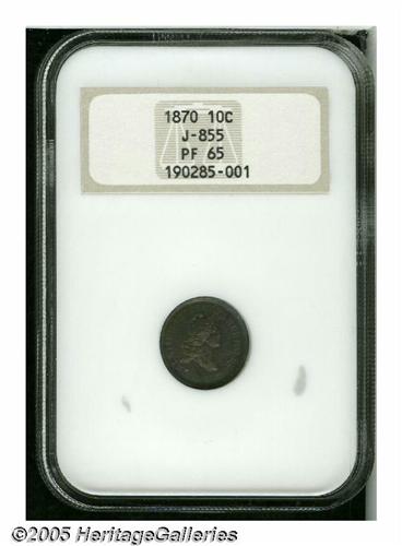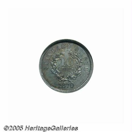 <B>1870<10C> Standard Silver Ten Cents, Judd-855, Pollock-935, High R.6, PR65 NGC.</B></I> Struck in silver with a reeded edge. The Standard Silver dime struck in .900 fine silver. The obverse has a representation of Liberty facing right with the statutory legend above and the motto below. The reverse has a small wreath around the denomination, with STANDARD SILVER above and the date below. The Standard Silver ten cent pieces were slightly smaller in diameter than the normal coinage issue, and easily confused with the half dimes of this pattern series. This is a deeply toned Gem Proof with exquisite iridescent toning and excellent eye appeal.