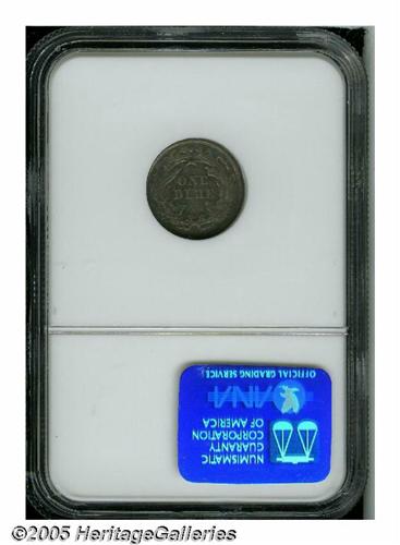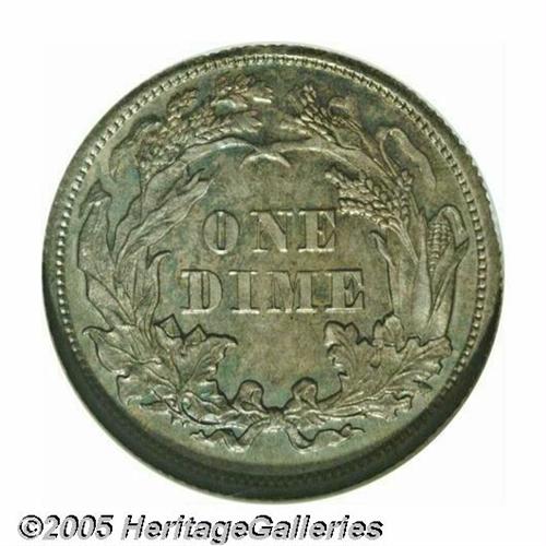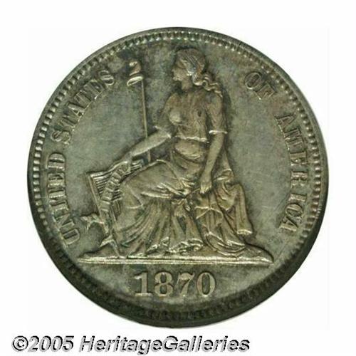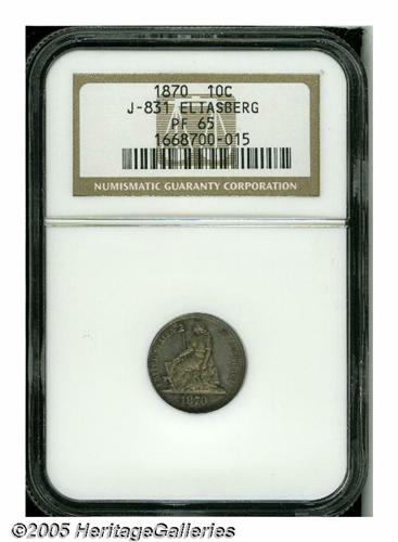 <B>1870<10C> Ten Cents, Judd-831, Pollock-921, High R.6, PR65 NGC.</B></I> Ex: Eliasberg. Designed by William Barber, the obverse depicts a seated figure of Liberty facing left and supporting a shield in her right hand, an olive branch in her left. A free-standing liberty pole is present behind the shield. Regular dies reverse. Struck in silver with a reeded edge. Original freckles of aqua-blue and golden-brown color grace this carefully preserved and pleasing specimen. Well struck save for a few grains at the top of the cereal wreath.<BR><I>Ex: Louis E. Eliasberg, Sr., Collection (Bowers and Merena, 5/96), lot 201.</B></I>