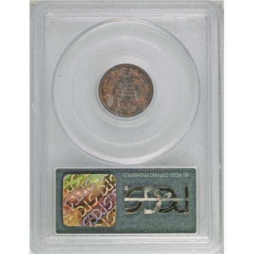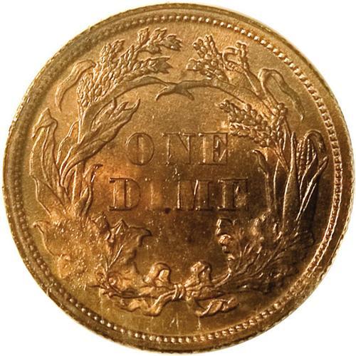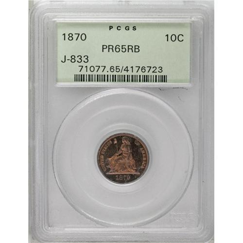 <B>1870<10C> Ten Cents, Judd-833, Pollock-923, High R.6, PR65 Red and Brown PCGS.</B></I> William Barber's Seated Liberty obverse is paired with a regular dies reverse. Barber's design gives the unintended impression that Liberty's arm is pierced by the Liberty pole. Struck in copper with a reeded edge. Deep cherry-red and lilac are prevalent, but blend with aquamarine across the open fields.