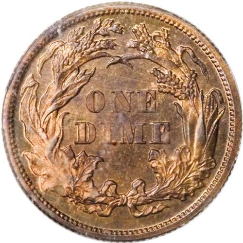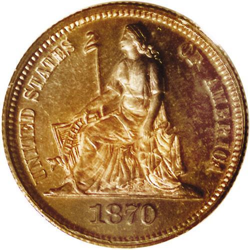 <B>1870 10C Ten Cents, Judd-833, Pollock-923, High R.6, PR65 Red and Brown PCGS.</B></I> William Barber's Seated Liberty obverse is paired with a regular dies reverse. Barber's design gives the unintended impression that Liberty's arm is pierced by the Liberty pole. Struck in copper with a reeded edge. About a dozen pieces are known today. Deep cherry-red and lilac are prevalent, but blend with aquamarine across the open fields.<BR><BR><b>Shipping:</b> Coins & Currency (<a target="_blank" href="http://www.heritageauctions.com/common/shipping.php">view shipping information</a>)