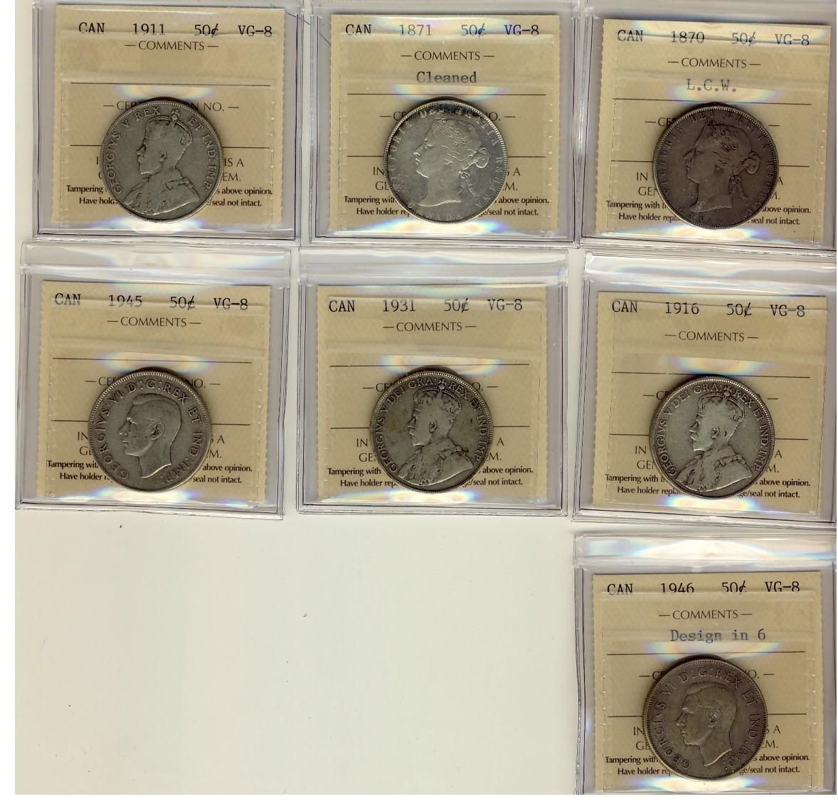 1870, 1871 Clnd, 1911, 1916, 1931, 1945 & 1946 Des 50¢ ICCS VG8. Lot of 7 coins.