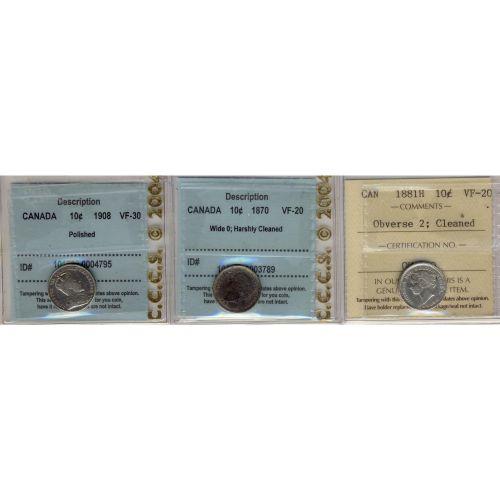 1870, 1881H and 1908 10¢. Lot of 3 coins all certified. 1870 Wide 0 Harshly Cleaned CCCS VF20, 1881H Obv 2 Cleaned ICCS VF20 and 1908 Polished CCCS VF30.