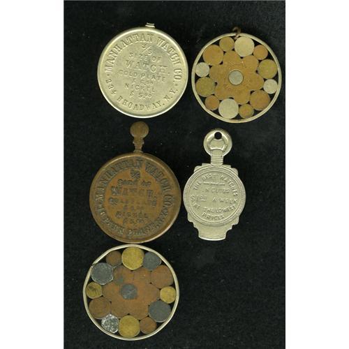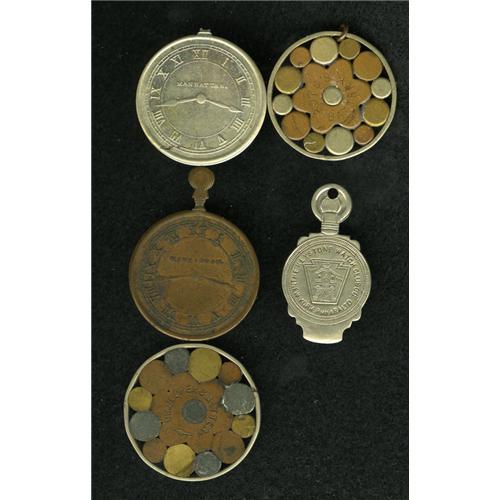 <B>(1870-1890s) Group Lot of Five Miscellaneous Tokens.</B></I> Included in this lot are a Boyd's Battery, NY-NY 33a; a Dr. Coopers Battery (an unlisted type) similar to the Boyd's Battery Token; a Manhattan Watch Co., NY-NY 177; a Keystone Watch Club, Brooklyn NY-Bkn 33a; and a Manhattan Watch Co., NY-NY 177b.