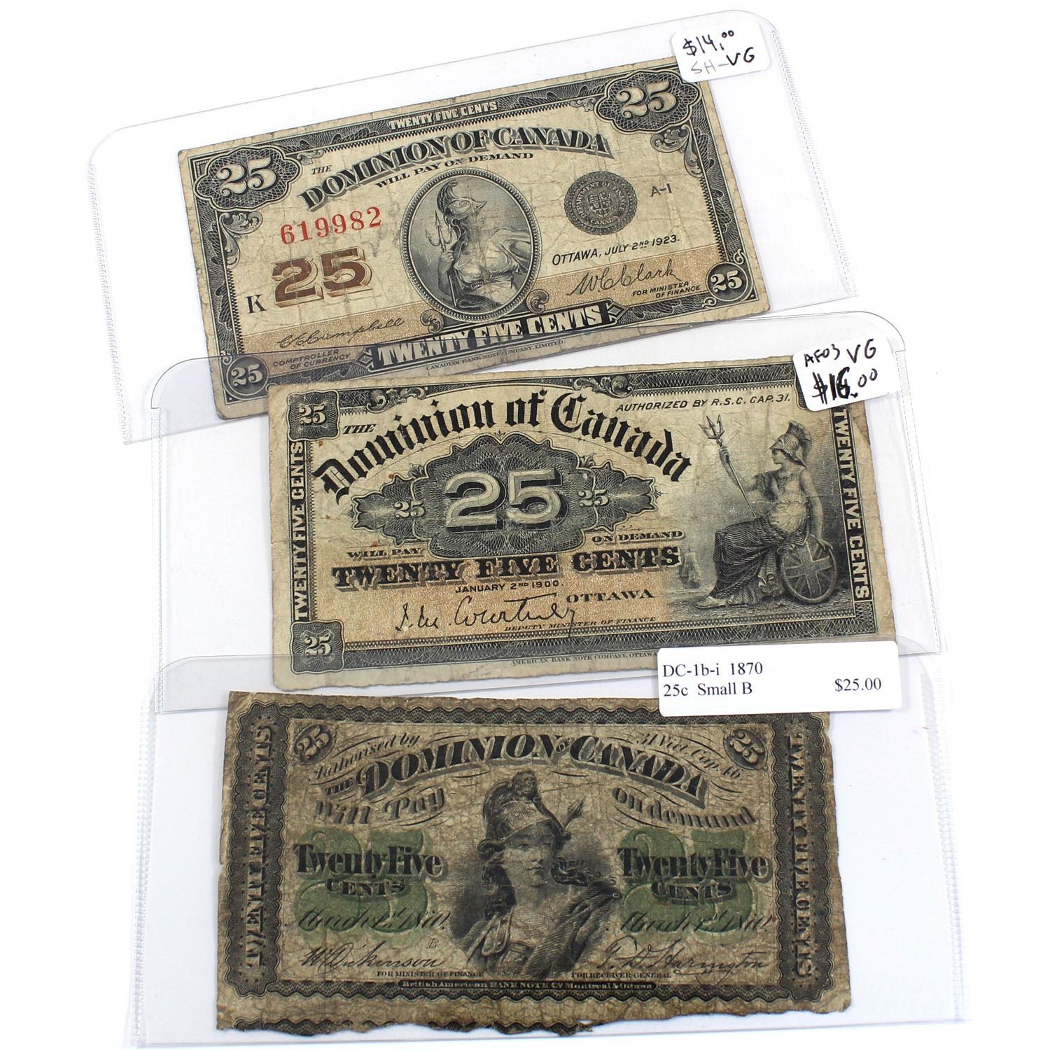 1870, 1900 & 1923 Dominion of Canada 25-cent Banknotes - Each Year Example of This Banknote Included. 3pcs