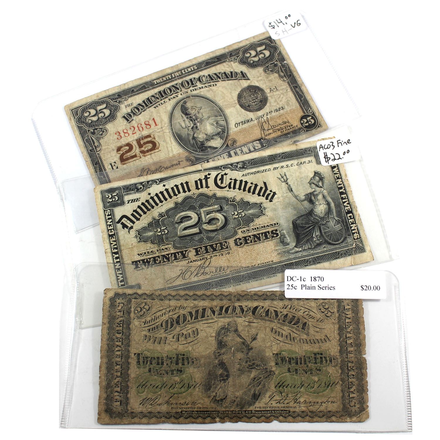 1870, 1900 & 1923 Dominion of Canada Notes - One Example of Each Year Printed. 3pcs