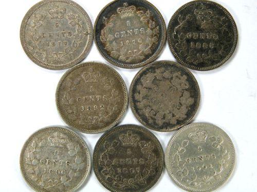 1870 Flat Boarder, 1870 Raised Boarder, 1885 Large 5, 1892, 1894, 1896, 1897 and 1901. Eight pale to medium toned pieces, Fine and better, mostly F-VF and better, some with problems