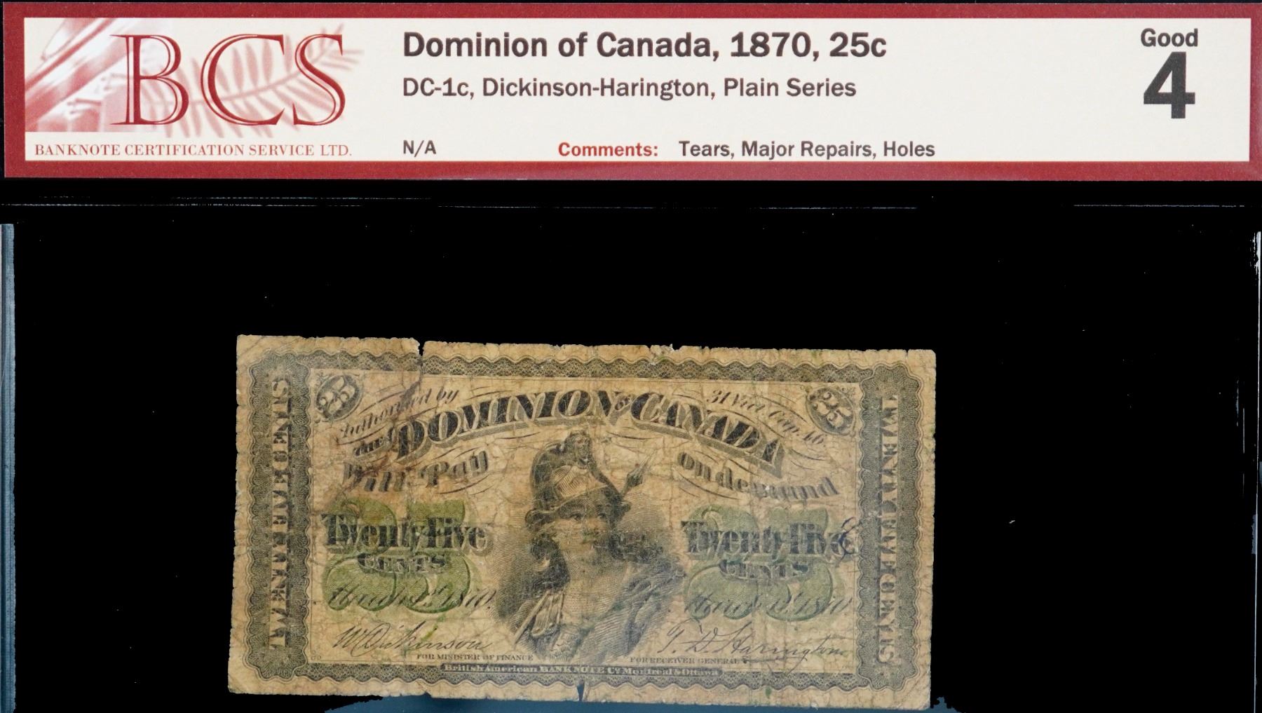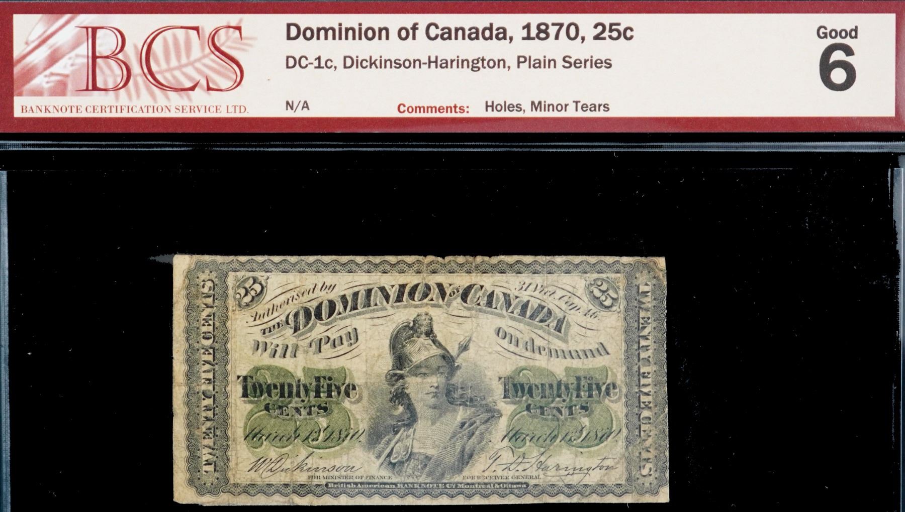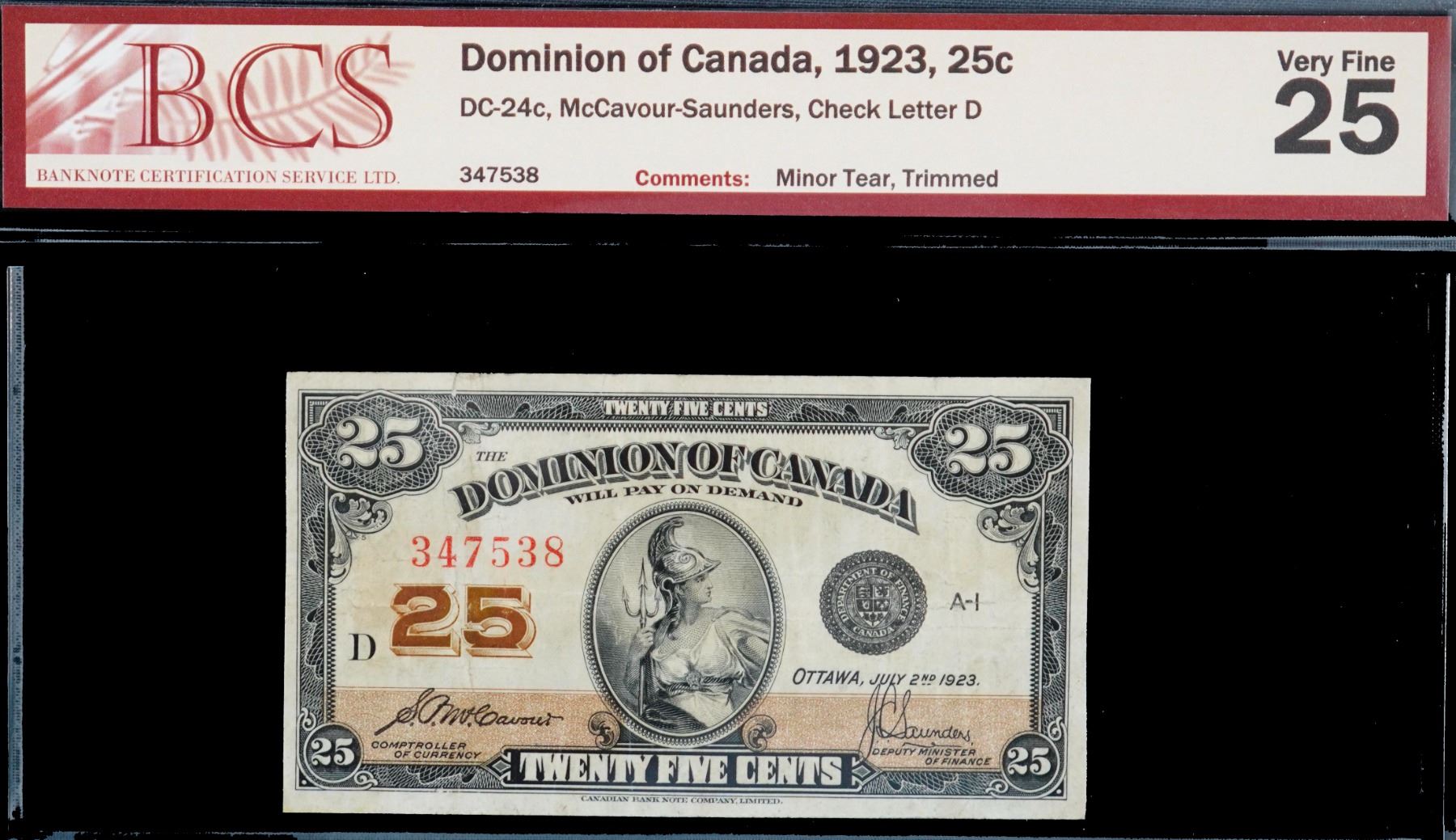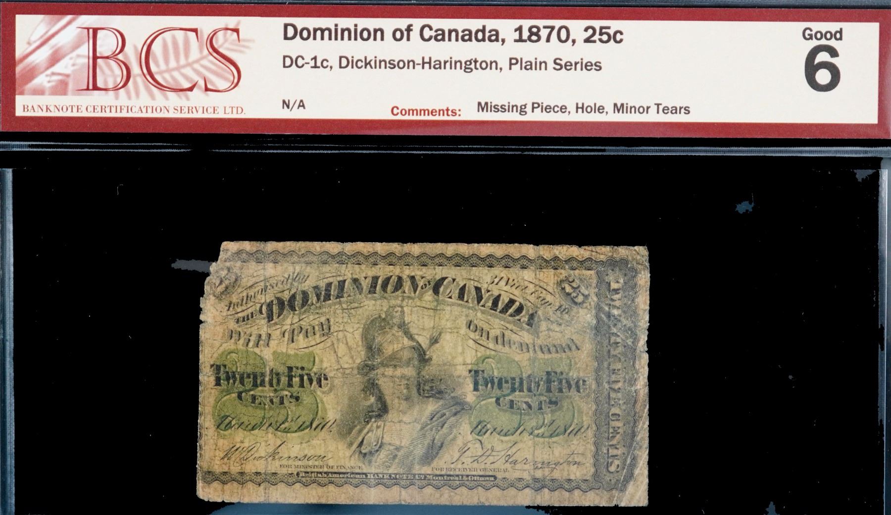 The cataloguer has taken every reasonable measure to ensure that all of the lots in this sale are as described and genuine. All raw coins and banknotes have been graded by the cataloger or the auction house which represent our best professional opinion. To grade coins and banknotes, we use Canadian grading standards, 42 years of experience and good conscience. However, grading is a subjective description in the opinion of the cataloger or the auction house. Among experts there are often differences of opinion on the grading and the eye appeal of a coin. The strike and the state of preservation are often debated. The Canadian Numismatic Company acts as an agent between consignors and buyers. The Canadian Numismatic Company does not guarantee that any coin or banknote cataloged will meet the standards, or the grade, of any third party grading companies. No warranty, whether impressed or implied. Items are as is, no warranty given. We cannot accept responsibility and waive all liability resulting in financial losses, and or incidentals accruing from the sale of any items, nor can we guarantee that items graded by third party services will grade the same if submitted to a different grading service or re-submitted to the same company. Statements by The Canadian Numismatic Company regarding the condition, the eye appeal, the strike and the population of items are for guidance only. All lots offered are sold "AS IS". Title to all lots remains with the auction house until paid for in full by the purchaser. But they are held at the risk of the purchaser once the time of the sale.