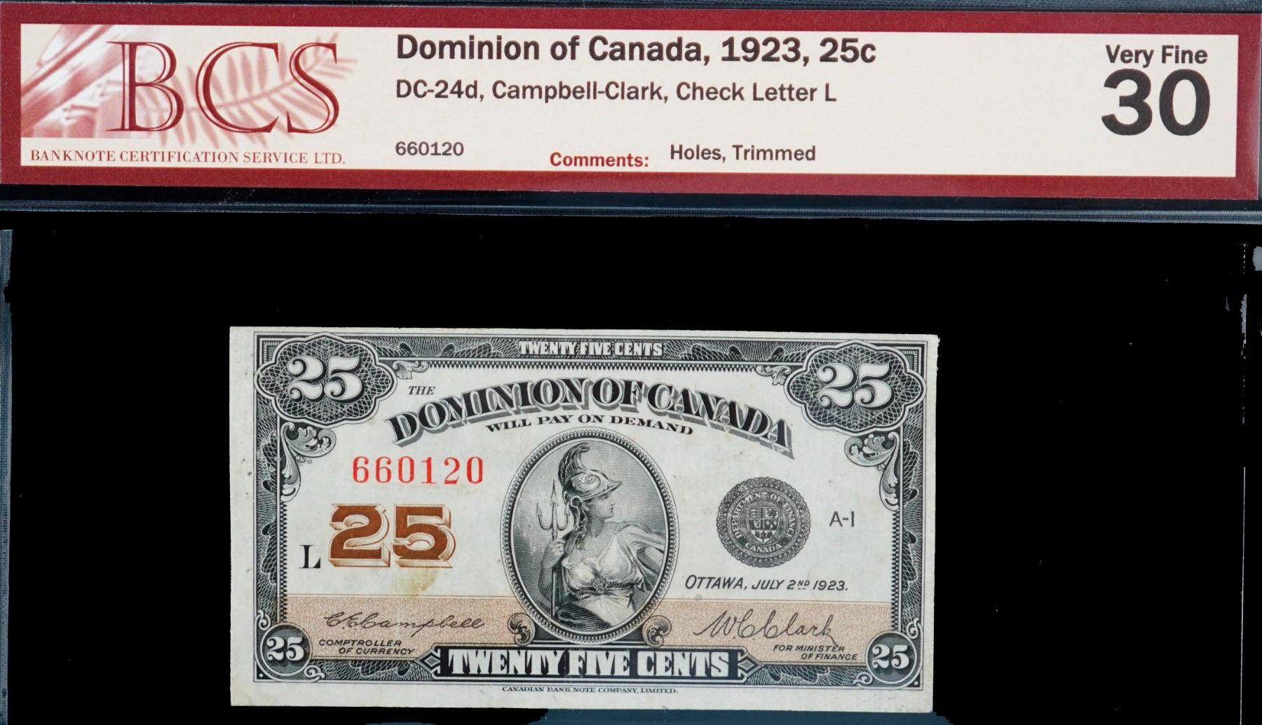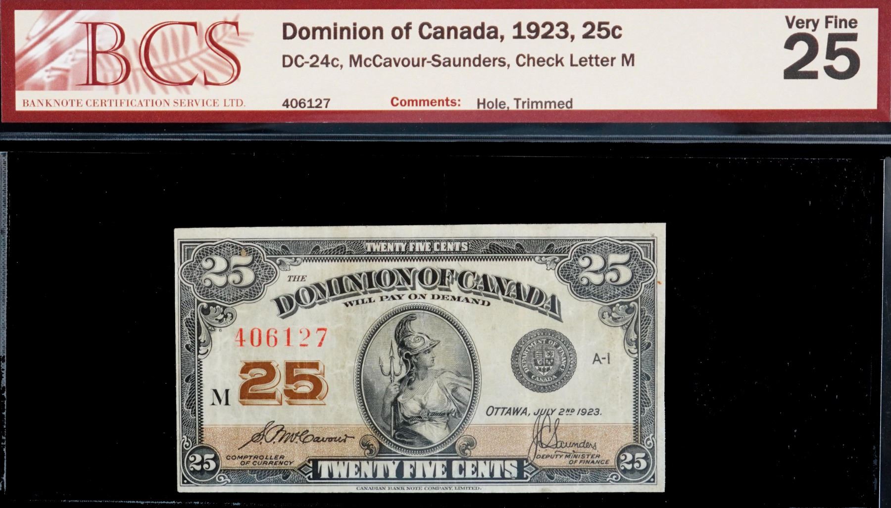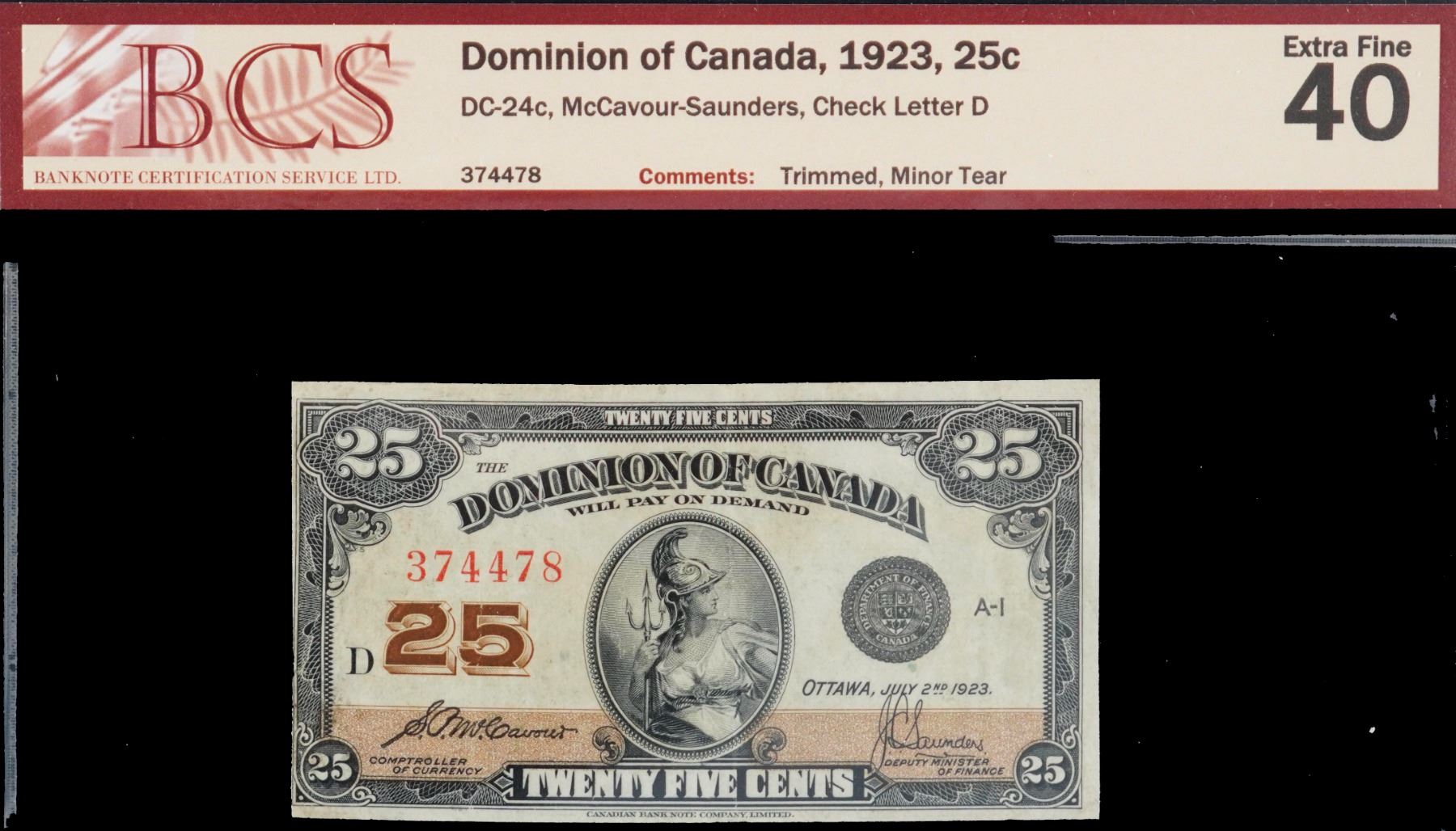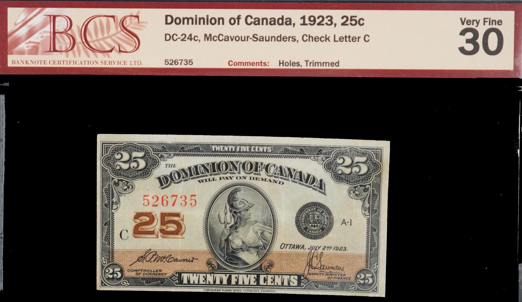 The cataloguer has taken every reasonable measure to ensure that all of the lots in this sale are as described and genuine. All raw coins and banknotes have been graded by the cataloger or the auction house which represent our best professional opinion. To grade coins and banknotes, we use Canadian grading standards, 42 years of experience and good conscience. However, grading is a subjective description in the opinion of the cataloger or the auction house. Among experts there are often differences of opinion on the grading and the eye appeal of a coin. The strike and the state of preservation are often debated. The Canadian Numismatic Company acts as an agent between consignors and buyers. The Canadian Numismatic Company does not guarantee that any coin or banknote cataloged will meet the standards, or the grade, of any third party grading companies. No warranty, whether impressed or implied. Items are as is, no warranty given. We cannot accept responsibility and waive all liability resulting in financial losses, and or incidentals accruing from the sale of any items, nor can we guarantee that items graded by third party services will grade the same if submitted to a different grading service or re-submitted to the same company. Statements by The Canadian Numismatic Company regarding the condition, the eye appeal, the strike and the population of items are for guidance only. All lots offered are sold "AS IS". Title to all lots remains with the auction house until paid for in full by the purchaser. But they are held at the risk of the purchaser once the time of the sale.