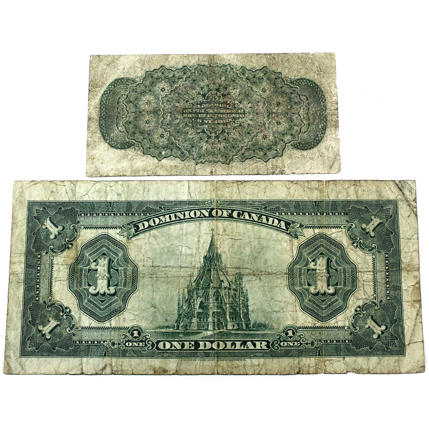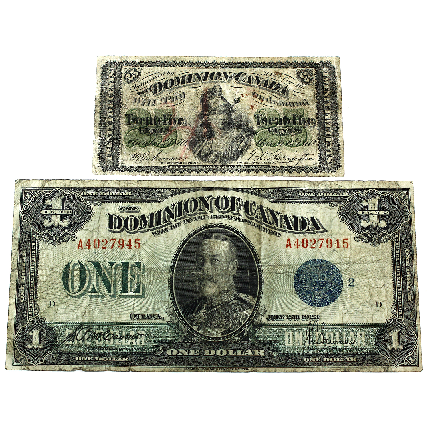 INCLUDES: DC-1c 1870 25-cent shinplaster Dickinson-Harington, & DC-25h 1923 $1 Blue Seal Group 2 McCavour-Saunders SN:A4027945. 2pcs.