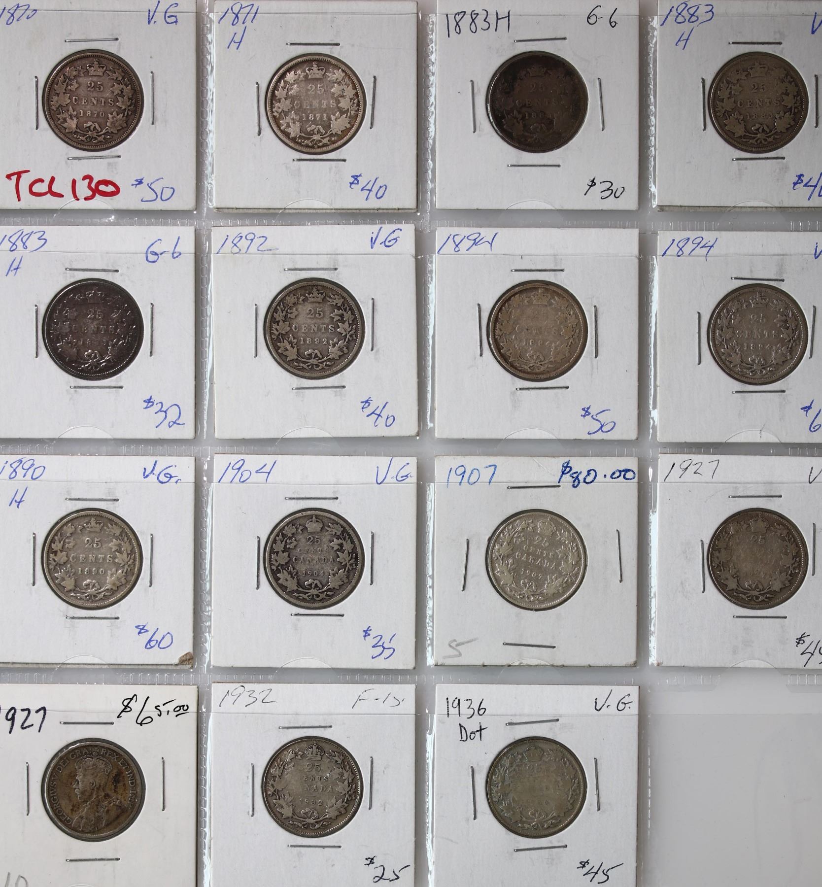 1870-1936 Dot 25¢, includes semi-key dates and better varieties. Lot of 15 coins. Good-4 to Very Good-10