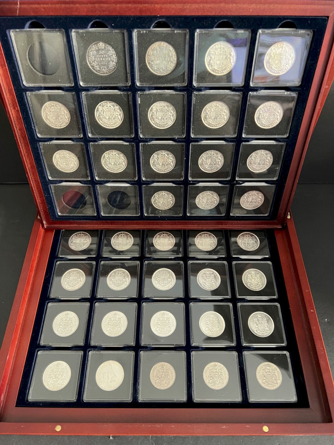 1870-1970 50¢, A nice "Half Dollar" Coin Collection. Lot of 60 pieces including better dates such as a 1932, 1947"ML", 1948. Housed in deluxe mahagony wood box. Grades vary from Good+ to UNC.