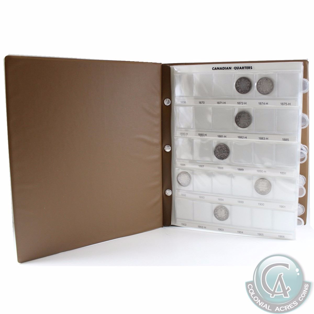 1870-1999 Canada 25-cent Collection brown Uni-Safe album. You will receive the following dates: 1872-H, 1874-H, 1882-H, 1888, 1892, 1900, 1903, 1907-1910, 1912,1913, 1916-1921, 1929, 1930, 1932-1934, 1936-1947, 1947 Maple Leaf, 1948-1953, 1954-1960, 1962-1968 Silver, 1968 Nickel, 1973, 1974-1989, all 12x Commemorative 1992, 1993-1996 and all 12x Commemorative 1999.
