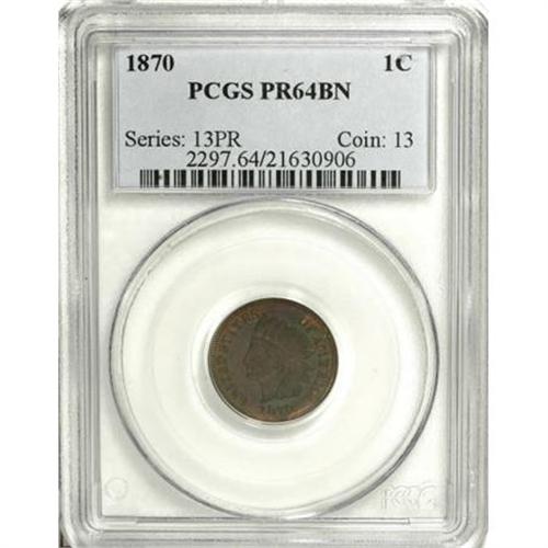 <B>1870 1C PR64 Brown PCGS.</B></I> PCGS Population (3/0). NGC Census: (8/6). Mintage: 1,000. Numismedia Wsl. Price for NGC/PCGS coin in PR64: $356. (#2297)<BR><BR><B>Coin Engraver:</B> James B. Longacre<BR><BR><b>Shipping:</b> Coins & Currency (<a target="_blank" href="http://www.heritageauctions.com/common/shipping.php">view shipping information</a>\)