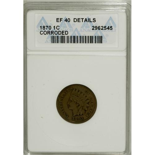 <B>1870 1C --Corroded--ANACS. XF40 Details.</B></I> NGC Census: (14/184). PCGS Population (22/152). Mintage: 5,275,000. Numismedia Wsl. Price: $283. (#2097)<BR><BR><b>Shipping:</b> Coins & Currency (<a target="_blank" href="http://www.heritageauctions.com/common/shipping.php">view shipping information</a>)