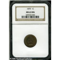 <B>1870 1C MS63 Brown NGC.</B></I> Tan and orange patina occupies each side. Adequately struck, though the Indian's hair and the second diamond from the top are soft. A few unobtrusive marks are noted on the Indian's cheek. Lot:5217