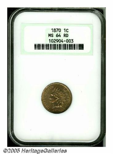 <B>1870<1C> MS64 Red NGC.</B></I> Glossy with mellow red color and a slightly irregular strike. The surfaces are clean save for the occasional minor spot.